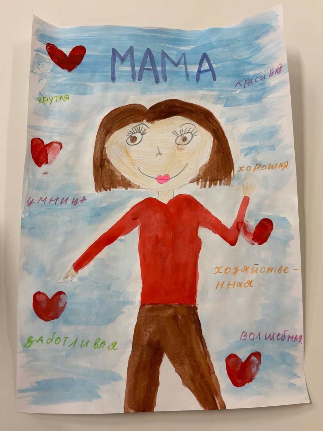 Картина выполнена с помощью простого карандаша, акварельный красок и гуаши. Картина отражает любовь дочери к маме, это видно в отпечатках пальцев автора в форме сердец