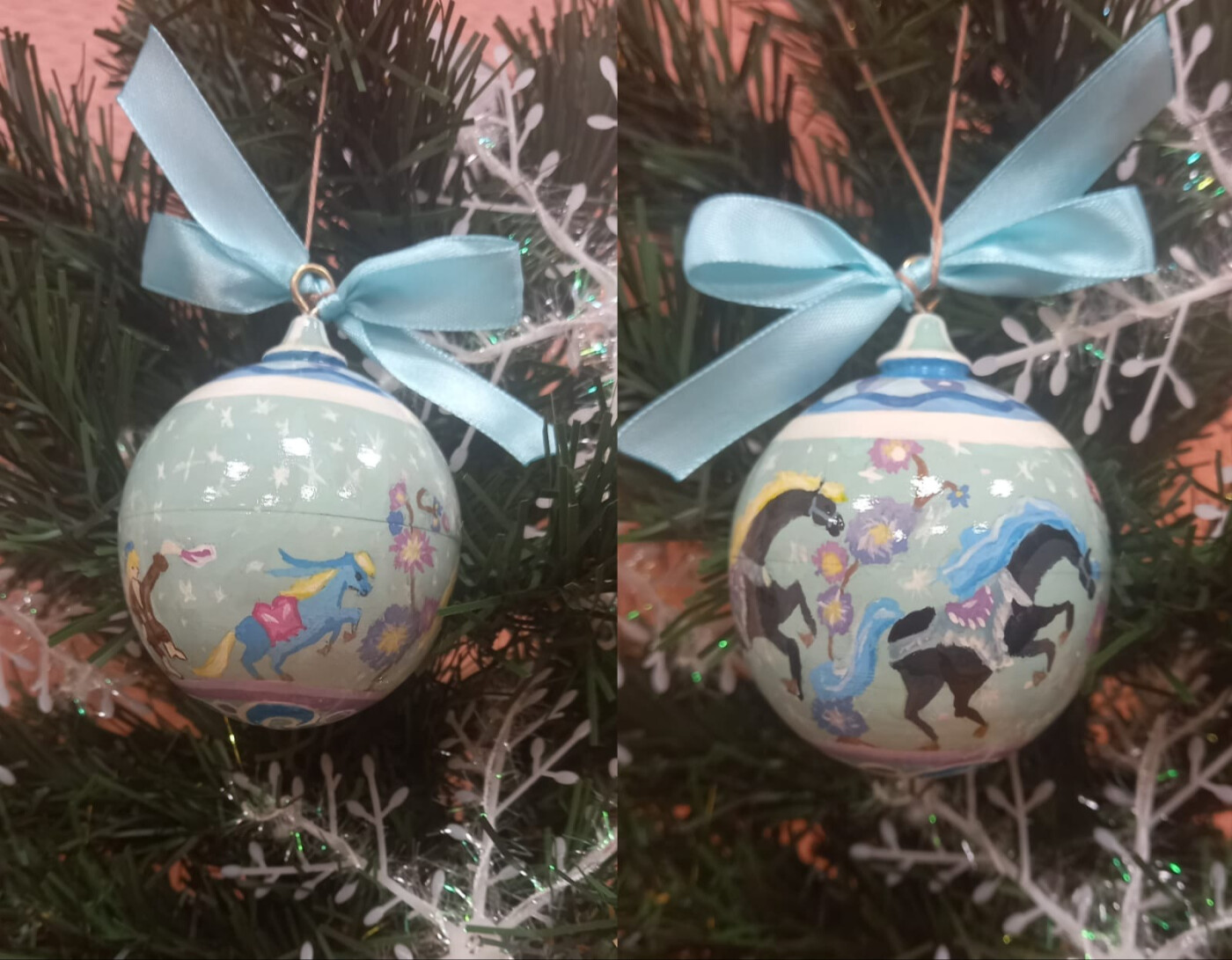 Описание работы: работа выполнена темперой и гуашью по деревянной заготовке, размер шара 6 см. По мотивам Холуйской росписи.
