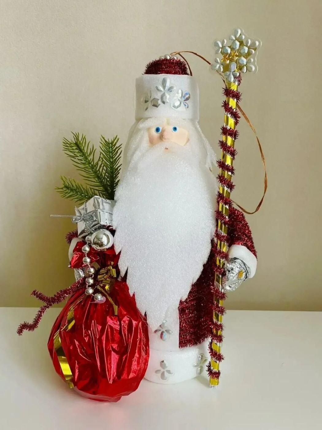 Поделка "Дедушка Мороз" частично выполнена из бросового материала: в основе пластиковая бутылка из под молока, посох из трубочки, борода, волосы и белые элементы костюма - из упаковочного полиэтилена. Вот так из того, что можно было бы выбросить, создать новогоднюю игрушку