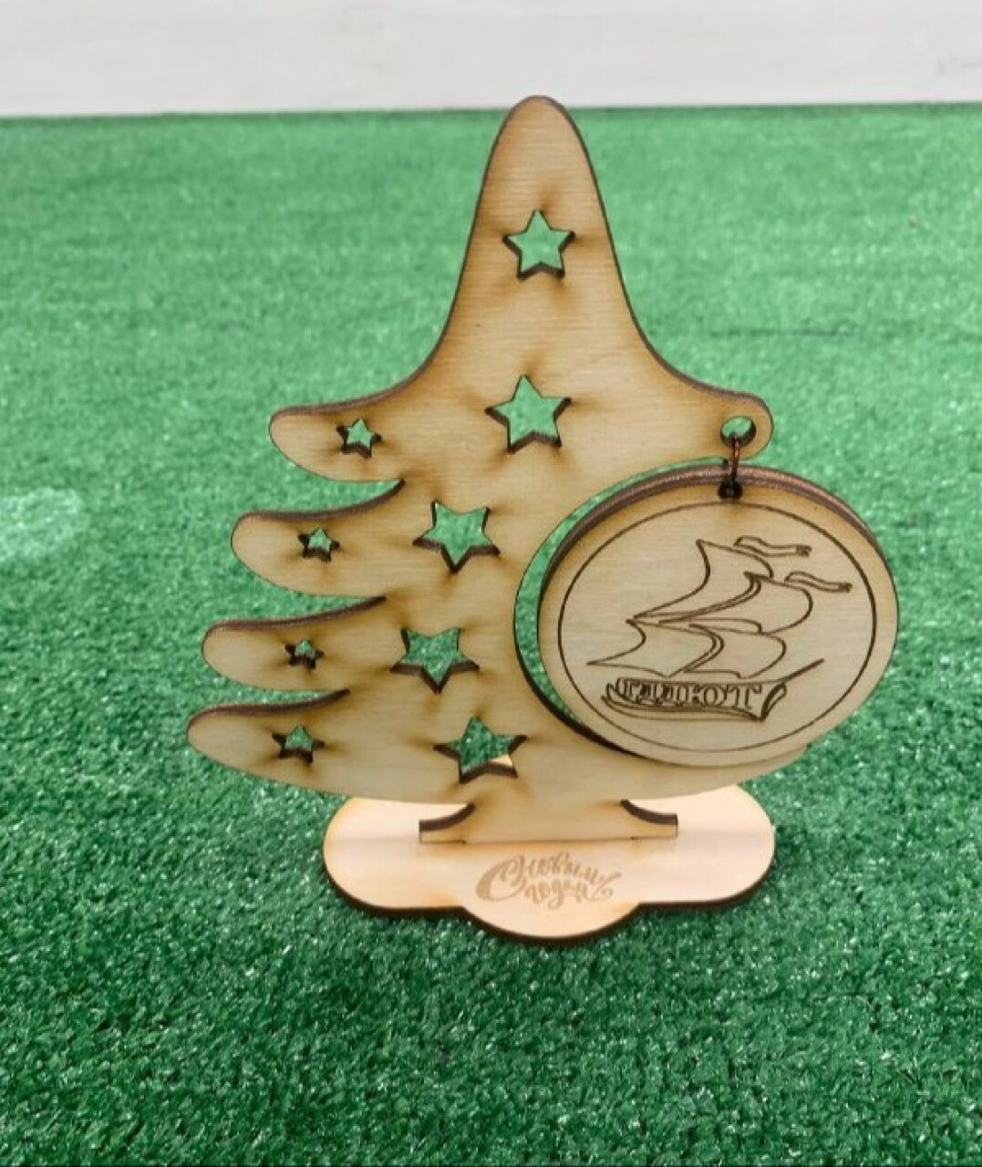 Макет выполнен на лазерном станке с ЧПУ из фанеры 3мм. Новогодняя ёлка с шариком, на котором изображен логотип нашего Дворца. Прекрасный подарок для сотрудников.
