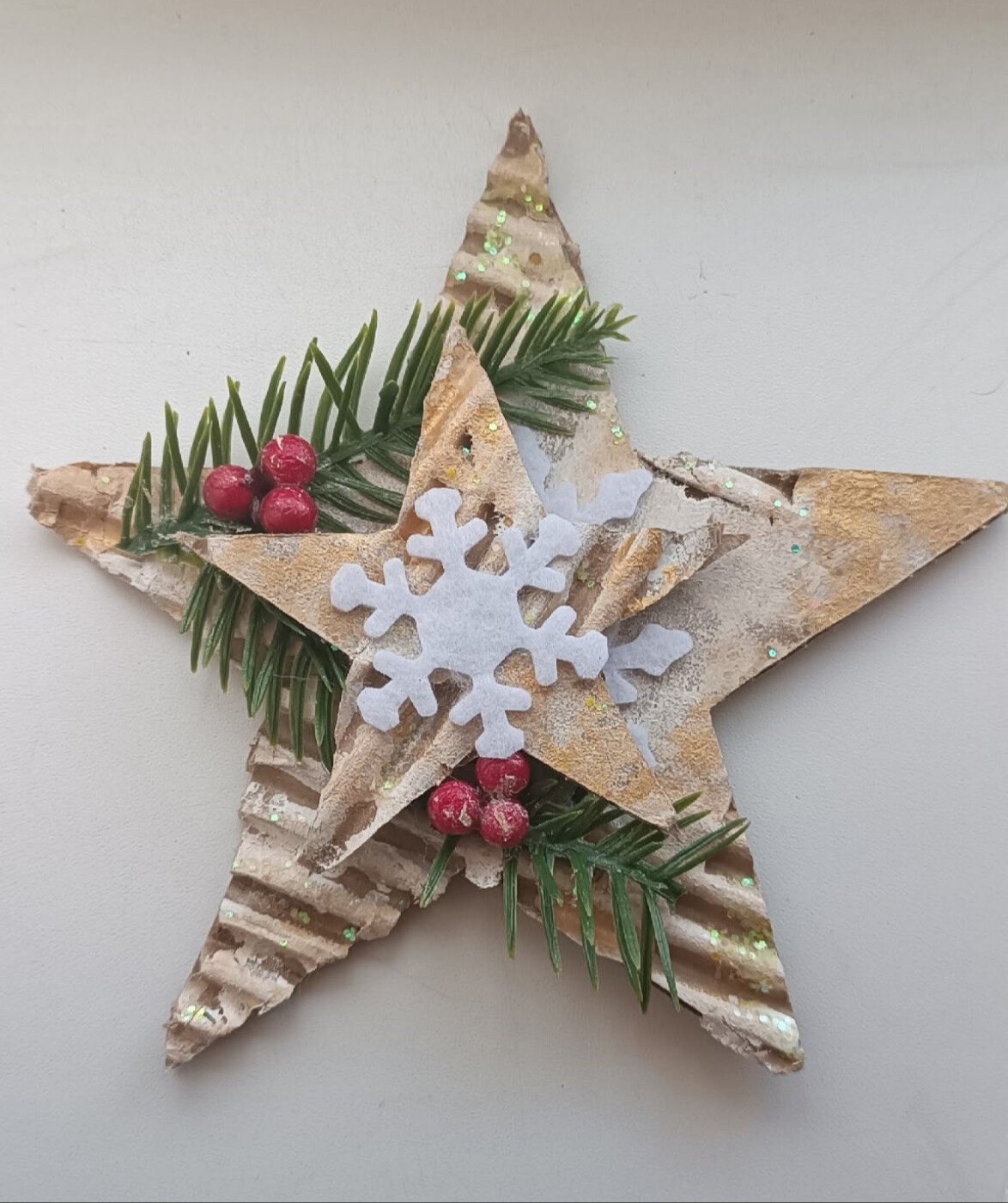 Данная работа выполнена из гофрокартона с использованием декоративных материалов (снежинки, веточки ели, бусины и блестки), красок.
