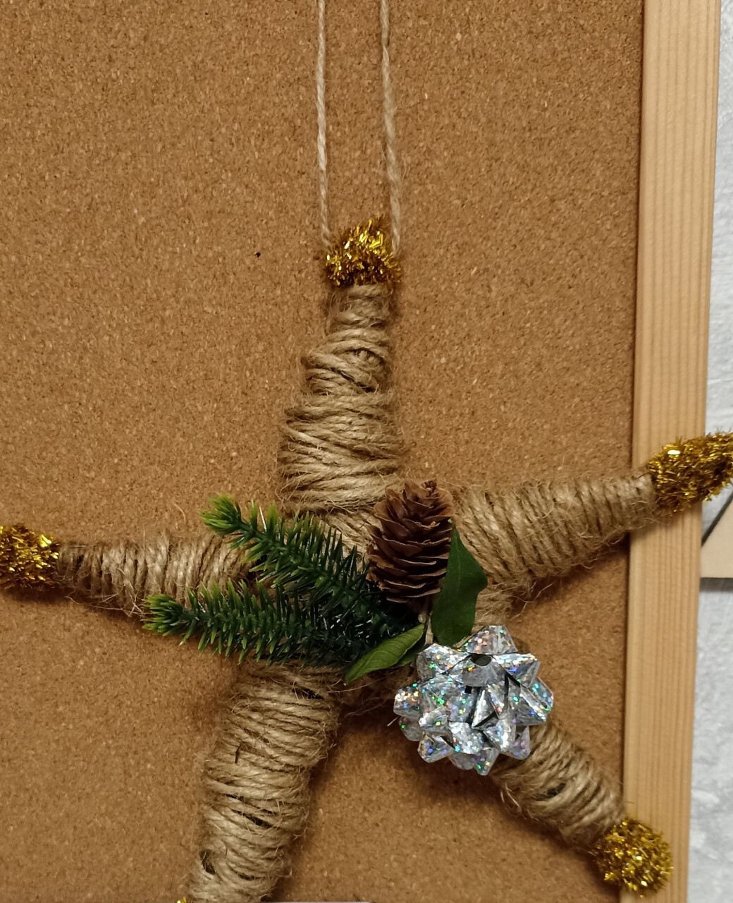 Когда наступает время волшебства, хочется чего-то нового. Я стараюсь бережно относиться к природе, поэтому мне захотелось создать новое украшение из старых. В работе использованы палочки аромодиффузера, джутовая верёвка, бантик, шишка и веточки от ёлки.
