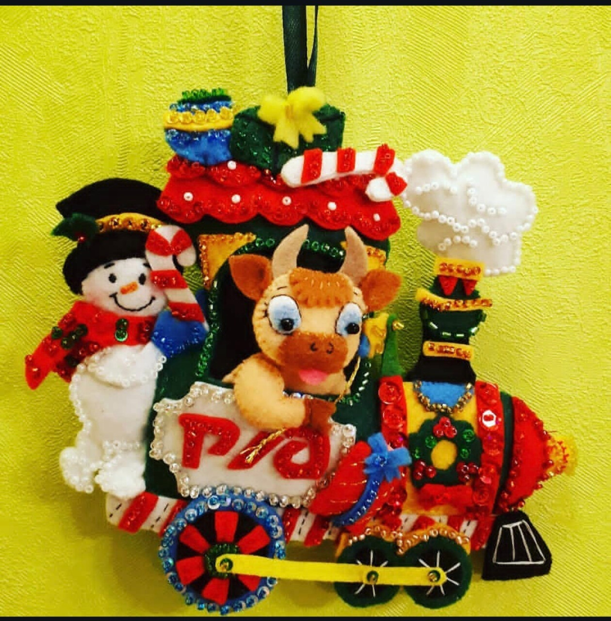 Основная часть — это поезд РЖД.Он украшен по-праздничному: подарки, новогодние венки и сладкие тросточки на нём вышиты разноцветным бисером, который красиво поблёскивает.