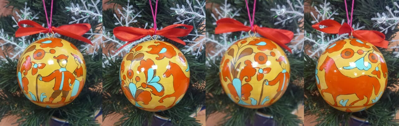 Работа выполнена темперными красками по деревянной заготовке ёлочный шар 8 см. Творческая композиция по мотивам росписи Северной Двины.