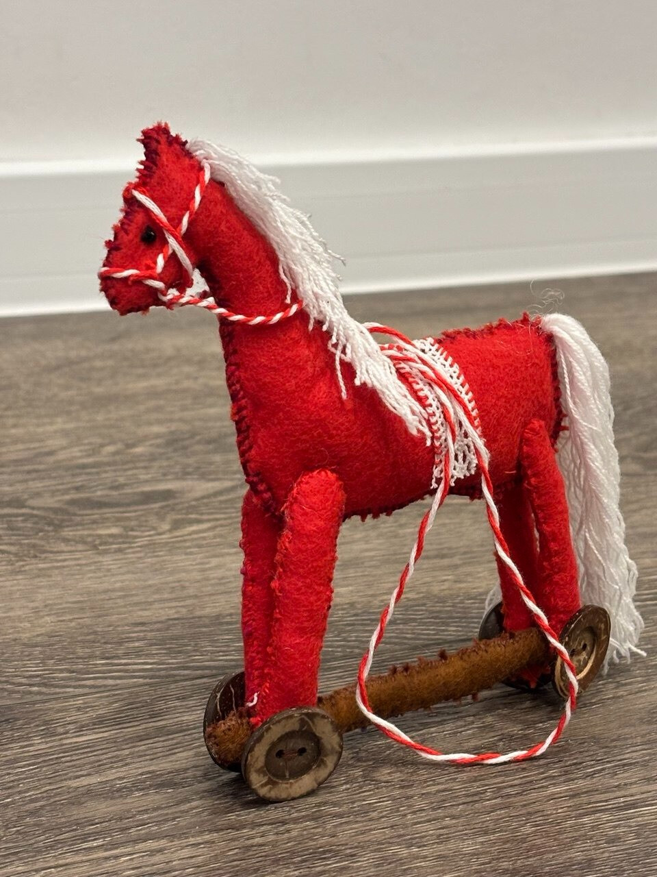На пороге Новый Год - уж лошадка у ворот. Моя лошадка ярко-красная, огненная как и символ наступающего года. Сделана она из фетра, хорошо держит форму за счет того что в нее вшита проволока. У нее серьезная мордочка, но, как видите, она на колесиках, как детская игрушка. Желаю всем чтобы этот год принес вам серьезные успехи, но все давалось легко, играючи. С наступающим 2026 годом.