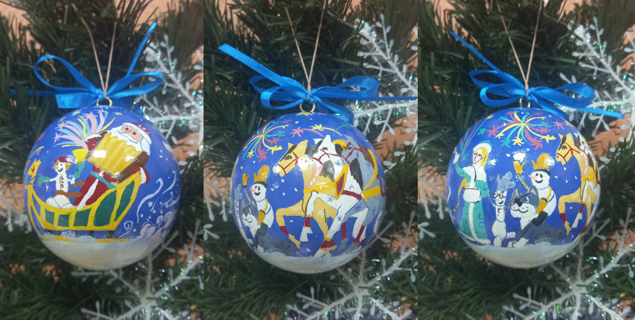 Работа выполнена темперными красками по деревянной заготовке, размер шара 8 см.