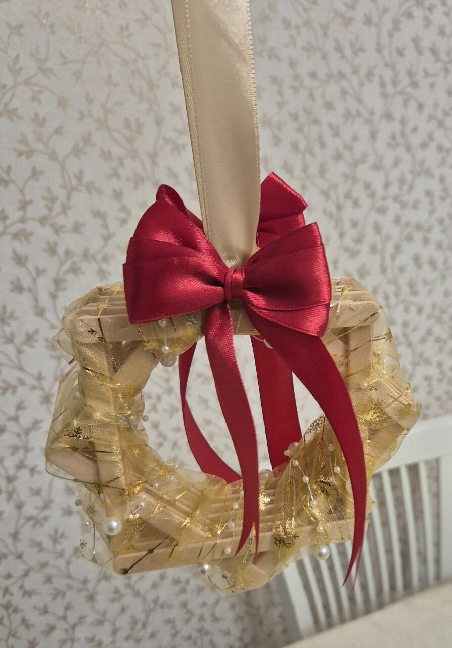 Восьмиконечная Вифлеемская Звезда выполнена из деревянных палочек для мороженого и лент собственноручно.