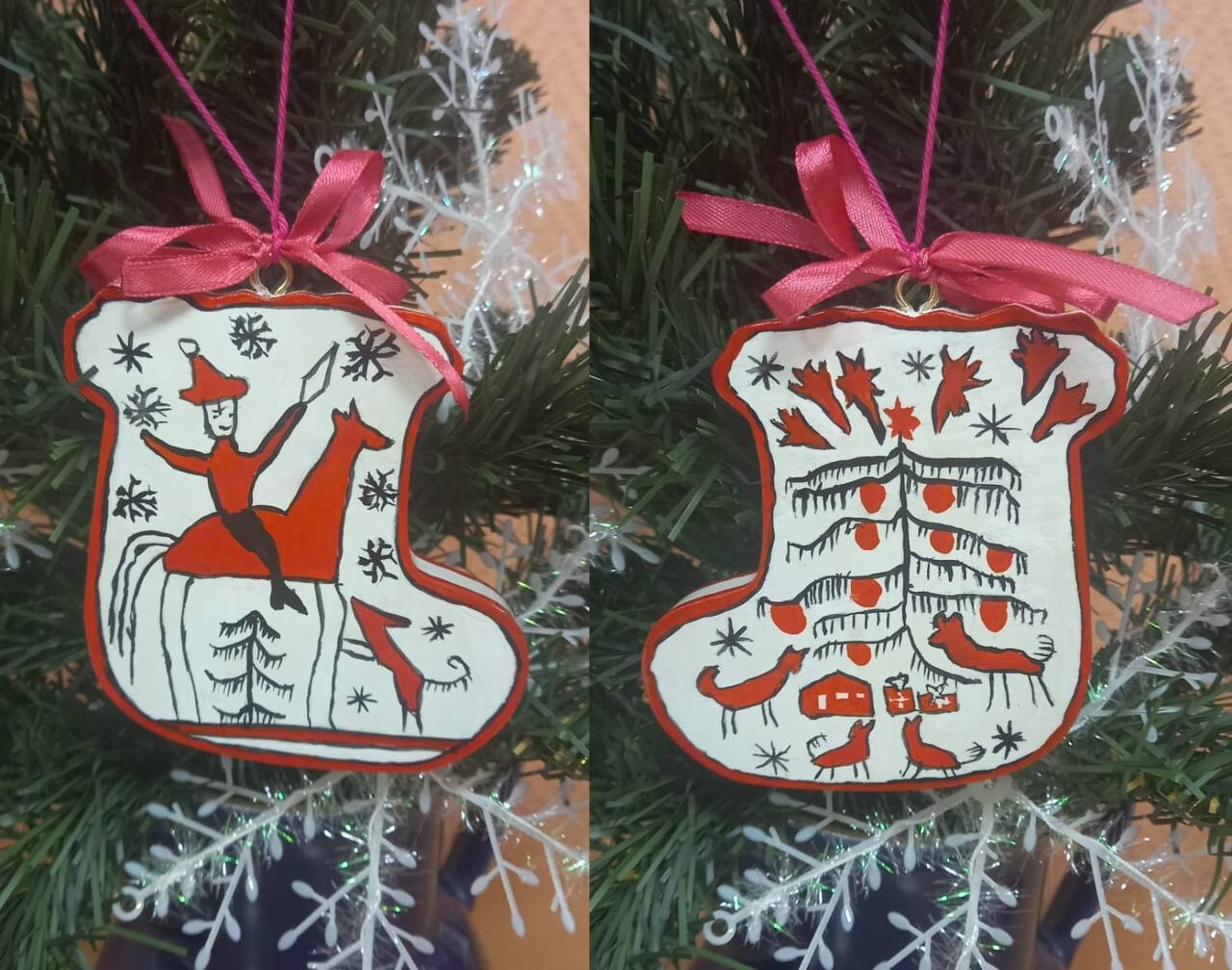 Работа выполнена темперой и гуашью по деревянной заготовке размером 10х2 см. Творческая композиция по мотивам мезенской росписи.