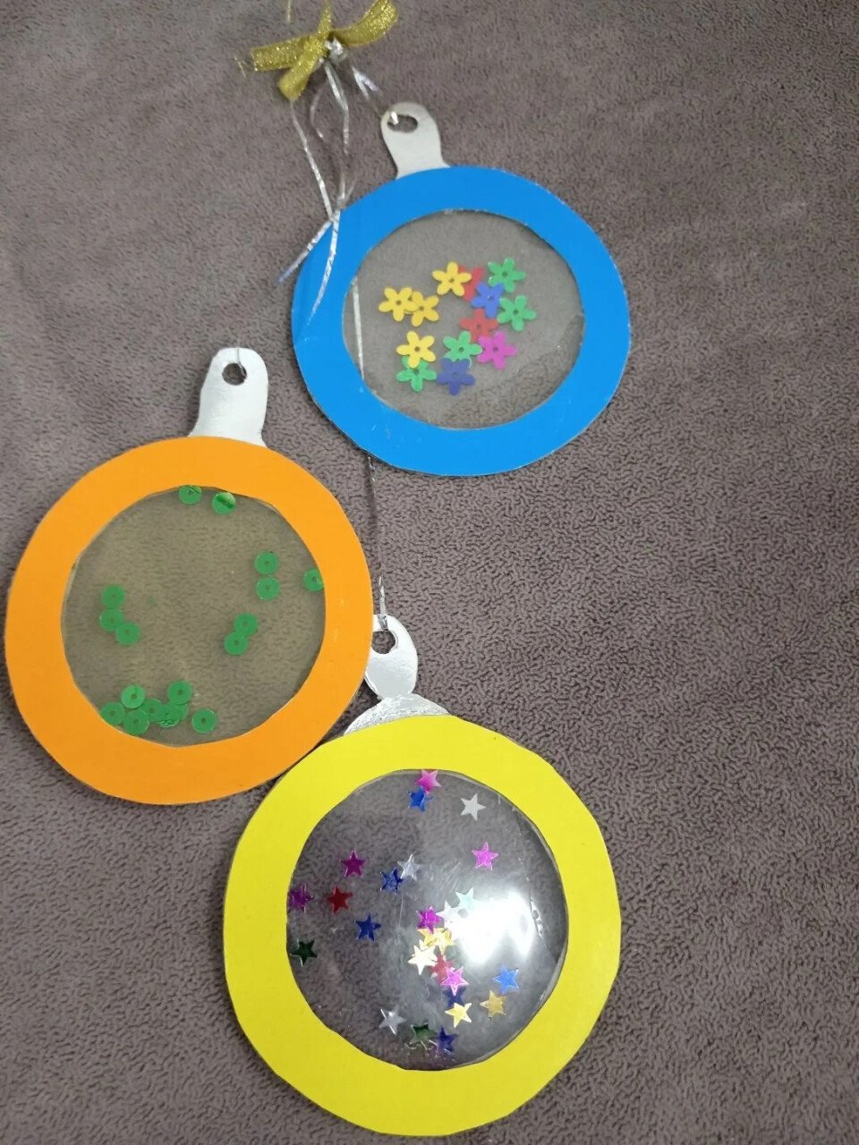 Эта поделка выполнена руками моей дочери из картона и пищевой плёнки с добавлением блёсток.Может украсить любую новогоднюю ёлку.