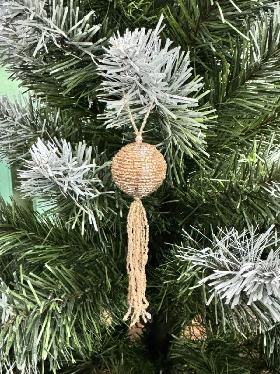 Замысел работы — передать волшебство зимнего праздника через игру света и фактуру бисера. Шар имитирует снежинку, застывшую в мгновении: переливающиеся бусины создают эффект искрящегося снега под лунным светом
