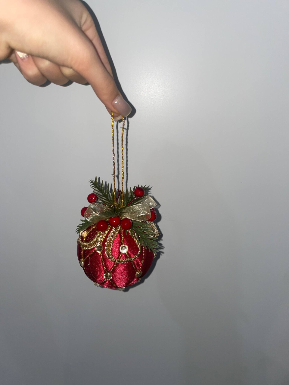 красиво оформленная новогодняя игрушка с ветками елки и ягодами рябины, так же я сделала красивую упаковку для этого шарика.