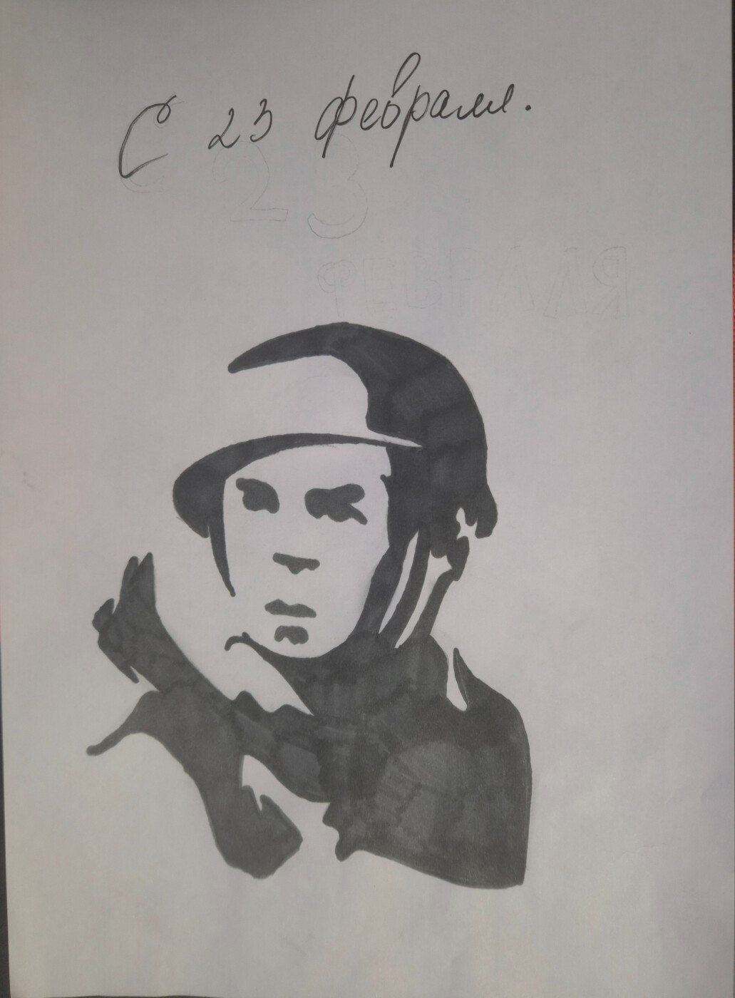 Над рисунком написано «С 23 февраля» — это поздравление всем, кто служил и служит Родине. Меня вдохновили рассказы о военных, их храбрости, выдержке и любви к своей стране. Своей работой я хотела выразить уважение и благодарность людям, которые защищают нашу Родину и дарят нам мирное небо над головой.