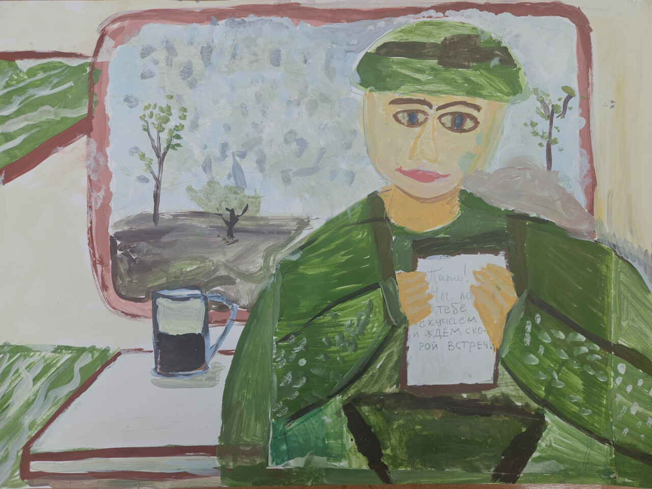 Письмо, которое держит в руках боец, трогательное, с лёгкой грустью и одновременно — согревающее. Улыбка бойца и детские слова дарят чувство связи с домом, напоминают о том, ради чего он идёт вперёд. Рисунок «Мы тебя ждём» — это благодарность, наполненная детской верой и надеждой.