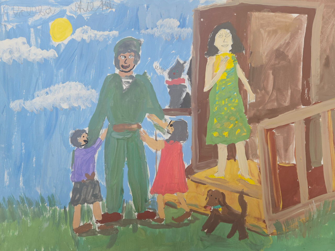Рисунок отражает радость встречи, благодарность герою и надежду на мирное будущее — семья снова вместе!