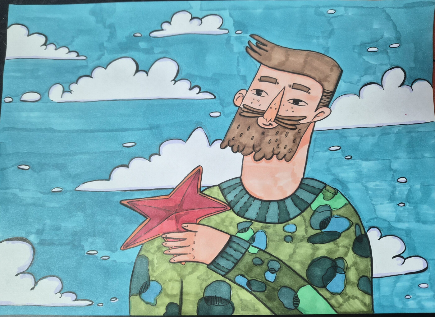 На моём рисунке изображён солдат — защитник нашей Родины. Он держит в руках красную звезду, которая символизирует мужество, силу и героизм. Я нарисовала его спокойным и уверенным, потому что считаю, что настоящий герой не только смелый, но и добрый, он защищает мир и людей. На фоне изображено голубое небо с облаками — это символ мирной жизни и светлого будущего, которое оберегают защитники Отечества.