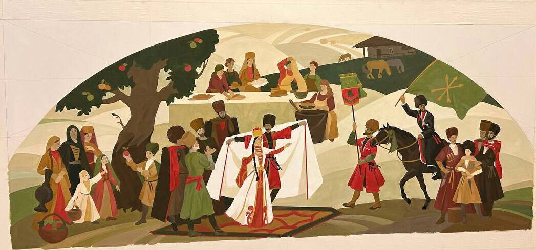 Прежде чем родилась, это большая и многогранная картины, было подготовлено более 50 эскизов и отдельных сюжетов. Каждый сюжет демонстрирует отдельную семейную традицию и обычай. От бытовых, ежедневных забот –это и правильное приготовление традиционной еды и национальных блюд до помпезных мероприятий, где участвовали все жители округи-свадьба, посадка родовых деревьев, конные походы.