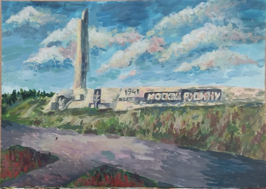 А3, гуашь. Изображён мемориал г. Зеленоград, г. Москва. 41км. Отсюда был взят прах неизвестного солдата, который сейчас находится на Красной площади. История ВОВ.