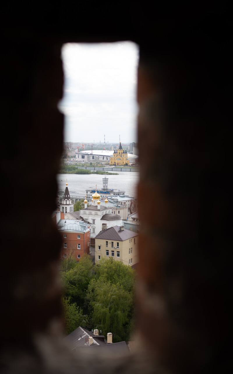 Фото сделано во время семейной прогулки по Нижегородскому Кремлю. Из бойницы древней крепости открывается вид на противоположный берег реки Оки, на котором стоит кафедральный собор во имя Святого Благоверного князя Александра Невского.