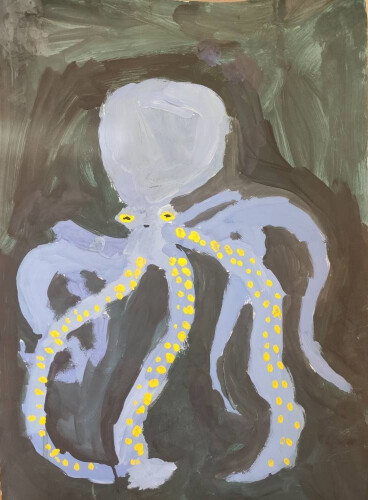 На глубине, в окружении таинственной темноты, ярко выделяется осьминог, чьи переливающиеся цвета создают завораживающий контраст. Этот обитатель морских глубин будто парит в безмолвном танце, демонстрируя свою загадочную красоту.