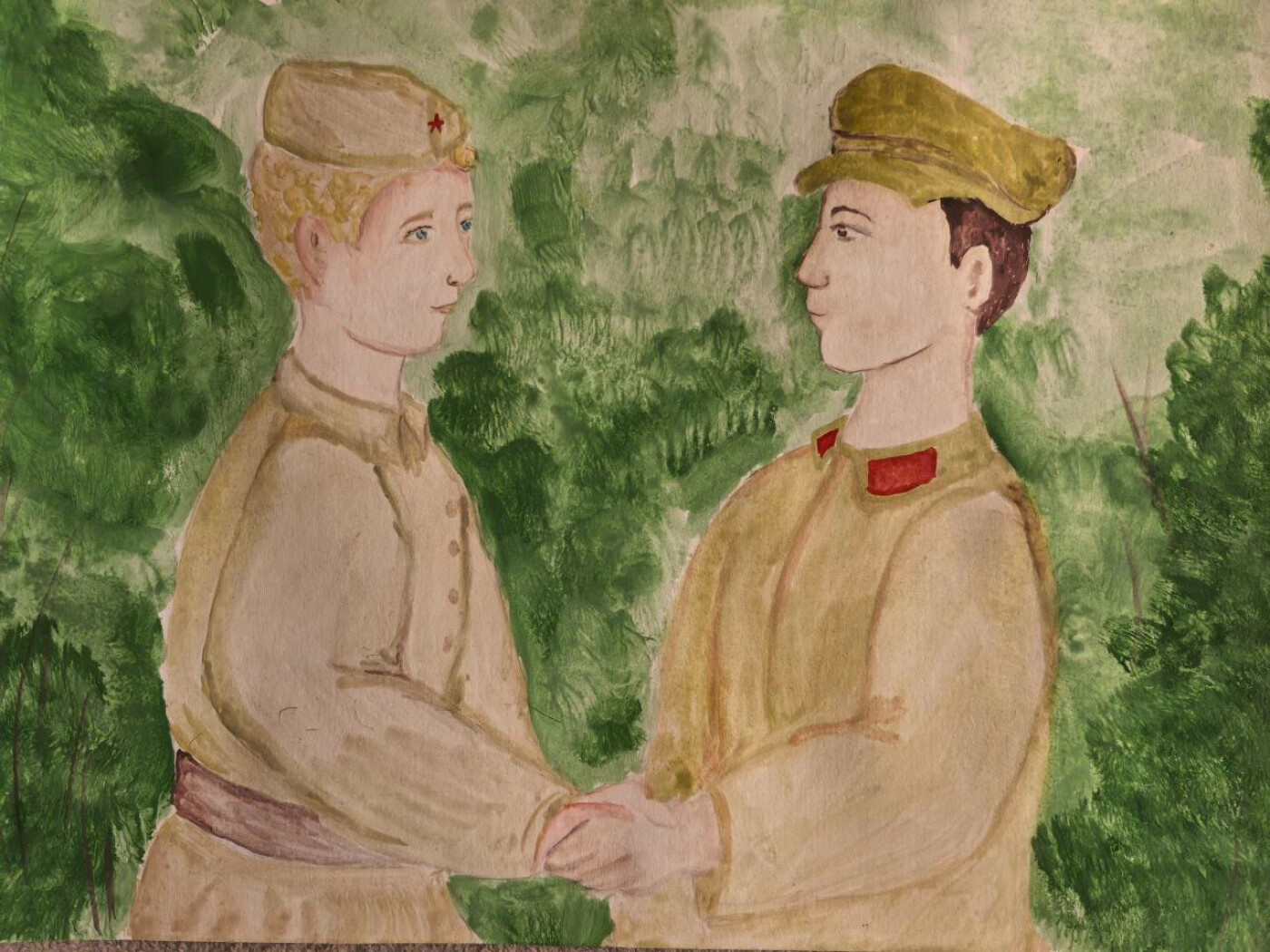 Рисунок выполнен гуашью в формате А3. На рисунке изображены солдаты русской краснознаменной и китайской армий. Они доброжелательно смотрят друг другу в глаза и улыбаются. Добрые отношения и единство в борьбе с фашизмом скреплены в рукопожатии двух бойцов.