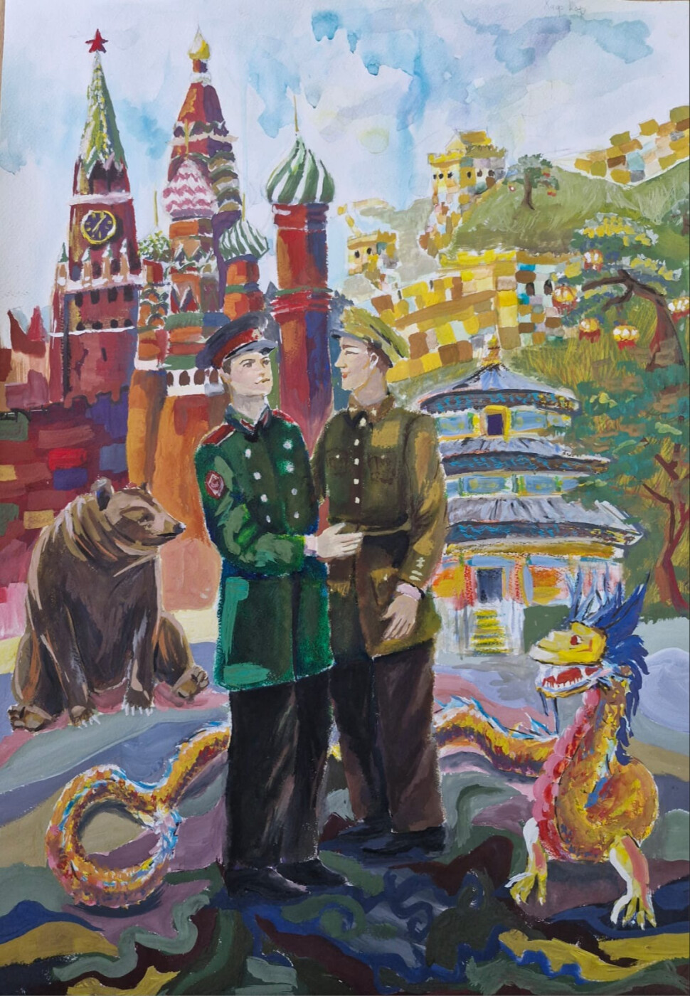 Свою композицию я хочу назвать ".Дружба навсегда".В ней я сосредоточила внимание на двух военнослужащих, расположенных рядом друг с другом, что символизирует взаимную поддержку и уважение. На заднем плане изображены узнаваемые символы обеих стран, олицетворяющие их историческое наследие и национальную гордость. Художественная концепция направлена на демонстрацию духа товарищества и взаимопомощи, характерных для взаимоотношений между народами СССР и Китая в период военных действий. Данное произведение является символом мира, дружбы и согласия, призывая к уважению и пониманию культурных особенностей.