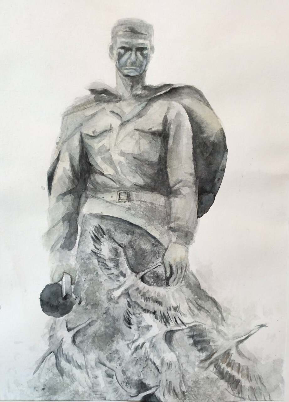 На рисунке изображен молодой воин в гимнастёрке, стоит завернувшись в плащ-палатку. Плащ полностью окружает его снизу и переходит в летящую стаю из 35 журавлей. Птицы покрывают несущую конструкцию, что создаёт эффект парящей в воздухе статуи.