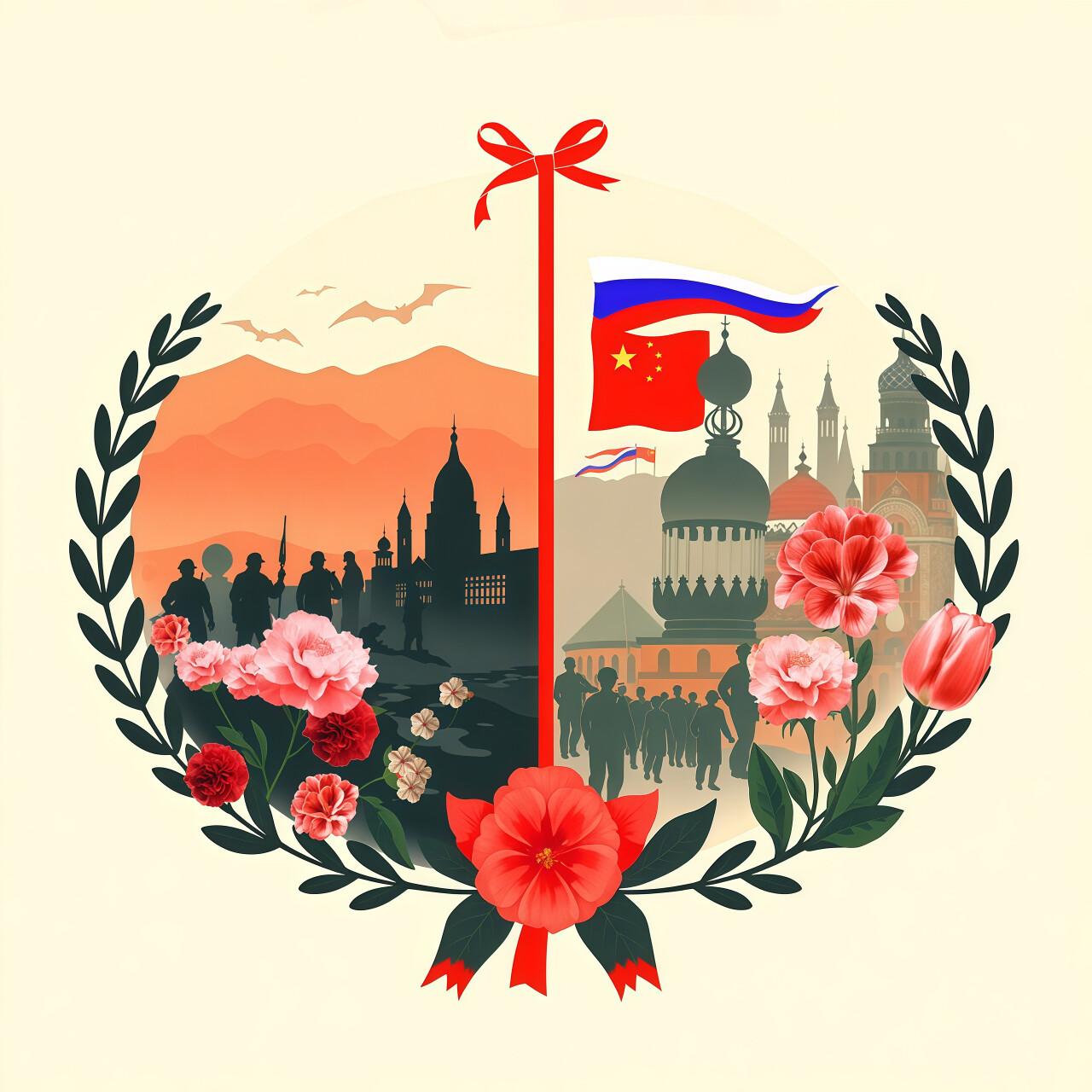 Историческая диптих‑иллюстрация «Память и единство»: два панно, объединенные лавровым венком (символом славы и победы), а также красной лентой. На левой части изображены фронтовые сцены: силуэты солдат, освобождение города. На правой — сцены послевоенного сотрудничества: восстановление, обмен культурой. Можно заметить символы: гвоздики и герань как цветки памяти; китайский пион и русские гвоздика и тюльпан — аккуратно объединенные. Работа в стиле ретро-постера.