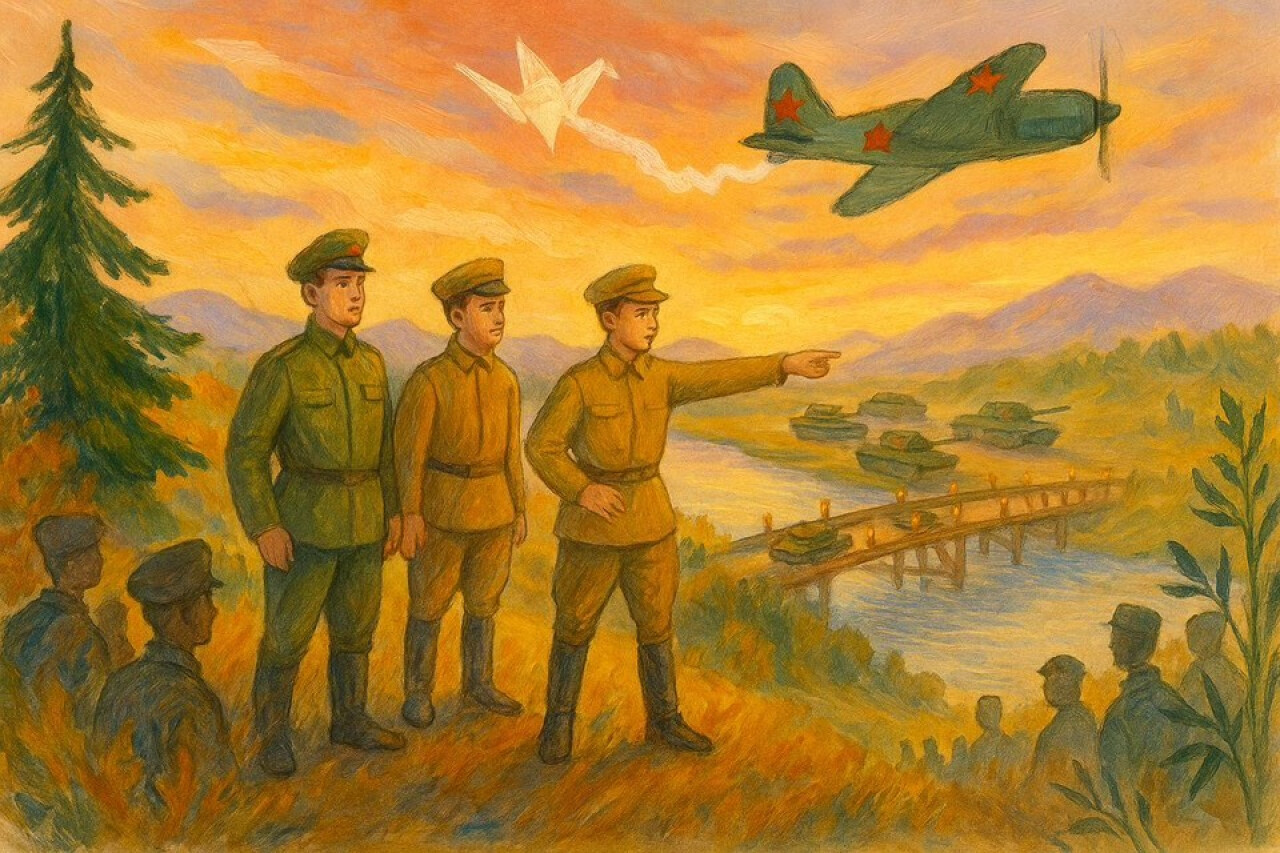 В этой цифровой версии мой рассвет становится шире: рядом с нашей елью появляются простые силуэты союзников — как вырезанные из бумаги. Они не для парада — они стоят, чтобы вместе смотреть туда, где светлеет небо. След за самолётом складывается в журавлика, и это похоже на письмо всем, кто воевал на Дальнем Востоке: «мы выросли и дружим». Два берега истории — российский и китайский — становятся одним берегом, потому что мир не знает границ. Танки внизу уже не страшат: они маленькие и далёкие, как память о тяжёлом пути, который прошли ради нас. Я очень хочу, чтобы дети России и Китая понимали слово «мир» одинаково — как тёплое утро, где слышно только ветер и смех. Эта работа — моё «спасибо» тем, кто подарил нам это утро.