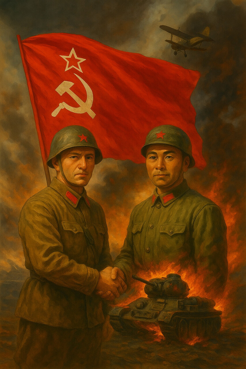 Вспоминая историю, я создал арт-картину, которая отражает дружбу между Россией и Китаем. Она называется «Помня историю, вместе рисуем мир!». На ней изображены два солдата наших стран, символизирующие их союз в годы Великой Отечественной войны. Несмотря на усталость, бомбежки и горящий танк, в руках солдат развевается флаг Победы. Мы победили! Это навсегда останется в нашей памяти, и мы гордимся нашими предками.