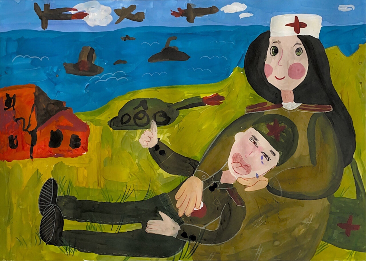 На этом рисунке я нарисовала русскую девушку-медсестру и китайского солдата, раненного в бою. Медсестра оказывает первую медицинскую помощь и утешает солдата, а за ними происходит битва и в воздухе, и на суше, и на воде.