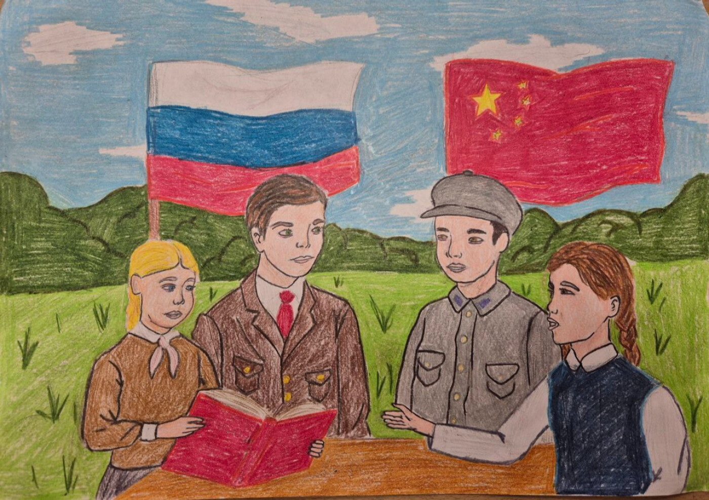 В созданном рисунке отражена идея дружбы и взаимопонимания между народами России и Китая, зародившаяся в годы совместной борьбы против фашизма и милитаризма. На картине изображены российские и китайские школьники, символизирующие молодое поколение, которое бережно хранит память о героическом прошлом своих стран. Фоны с национальными флагами подчеркивают единство и уважение к истории каждой державы. Открытая книга в руках учащихся символизирует знание, преемственность и мирное сотрудничество в будущем. Главная идея произведения — показать, что совместная победа в годы Второй мировой войны стала прочным фундаментом для дружбы, культурного обмена и развития гуманистических ценностей между Россией и Китаем.