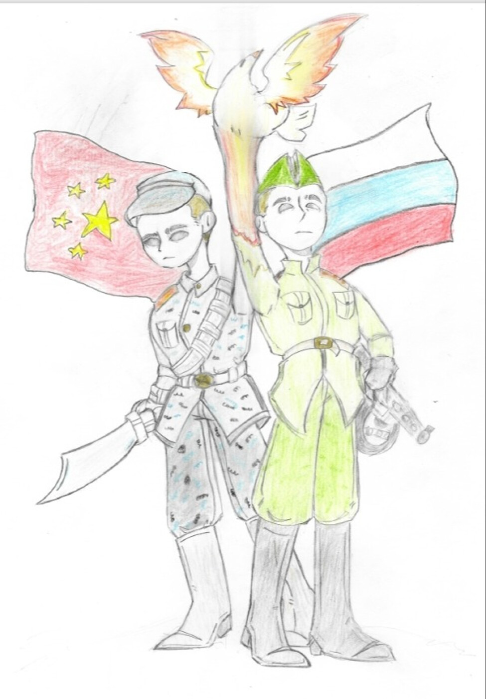 Творческая работа, отражает союзничество России и Китая, может показывать военные операции, поставки вооружения, участие советских добровольцев в китайской армии, развитие совместной стратегии борьбы с агрессором. Это могло бы подчеркнуть важную роль каждого государства в достижении победы над тоталитарными силами.