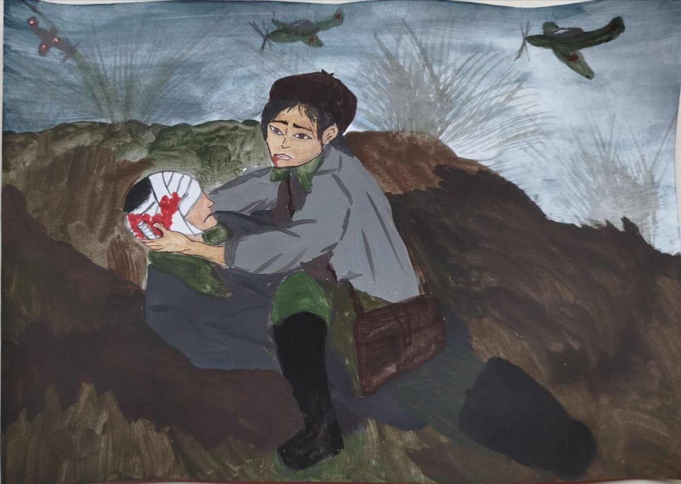 Китайская медсестра оказывает помощь советскому солдату в непростых условиях. Кругом идут ожесточенные бои.