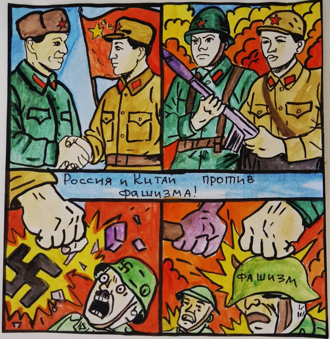 1. **Первая сцена**: Российский воин в традиционной военной форме и китайский воин в доспехах обмениваются рукопожатием. Их лица выражают уважение и дружбу, что символизирует союз двух великих наций.