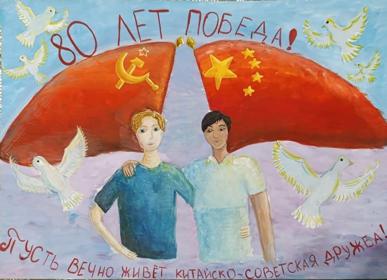 В своей работе мне хотелось отобразить тему дружбы двух стран. Голуби символизируют мир.