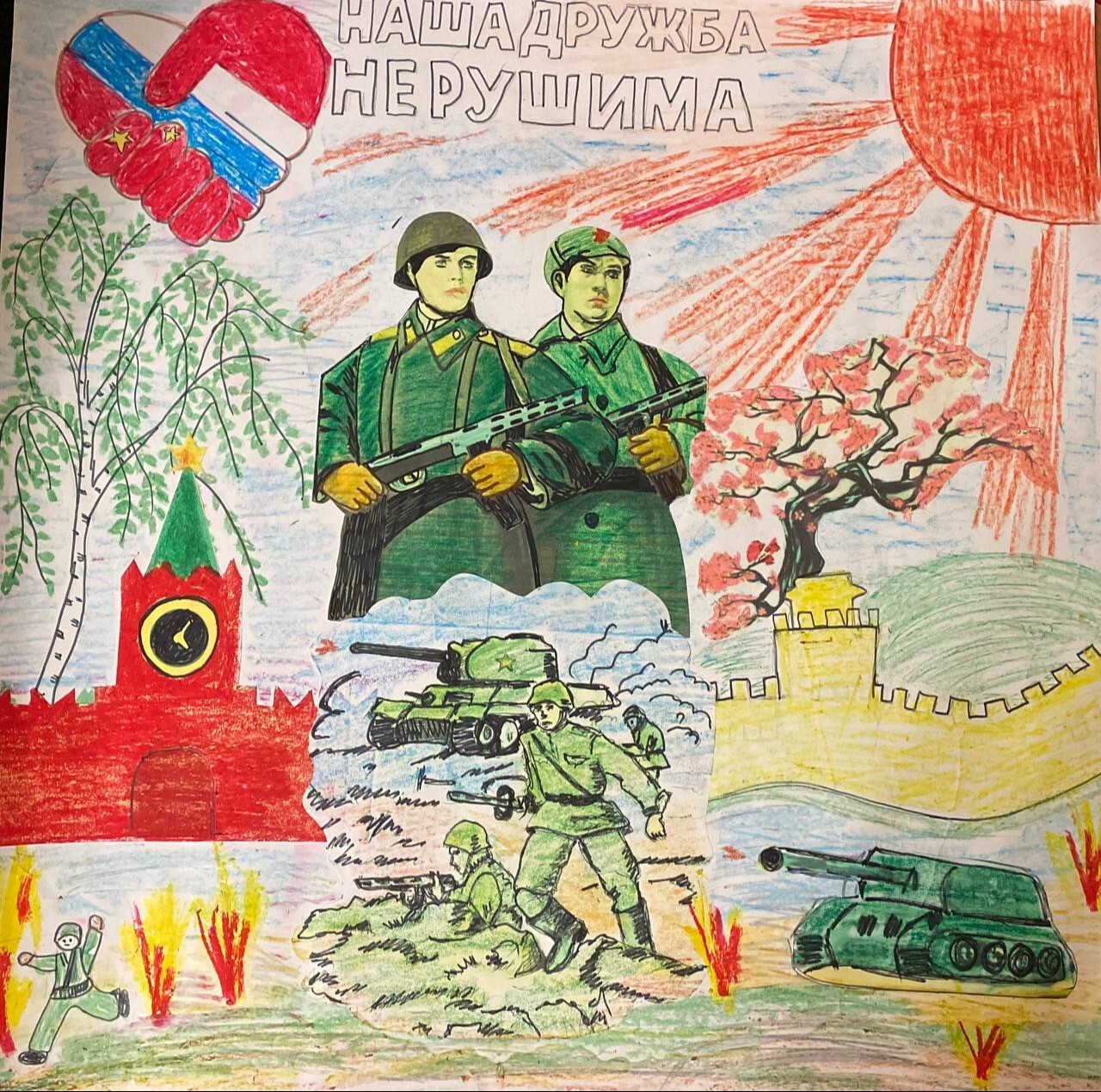 Сотрудничество и единство народов России и КНР, а также поддержка друг друга помогла противостоять в борьбе с фашистским и милитаристским режимами. Сражаясь плечом к плечу, народы КНР и РФ заложили узы великой дружбы и эта великая дружба великих стран с каждым днём становится всё крепче. В своей работе мне хотелось отразить и показать символы дружбы России и КНР, которые проявляются в каждом совместном проекте, начиная от мостов через Амур и до международных фестивалей, которые обьединяют традиции двух великих народов. Российский флаг триколор и китайский флаг с пятью звёздами означает крепкую дружбу, проверенную временем. Как русская берёзка и китайская сакура, дружба России и Китая расцветает яркими красками взаимного обогащения культур и взаимопонимания. От Великой Китайской до Кремлевской стены символы дружбы этих великих стран видны в каждой улыбке людей, обьединённых общими целями и в каждом совместном достижении.