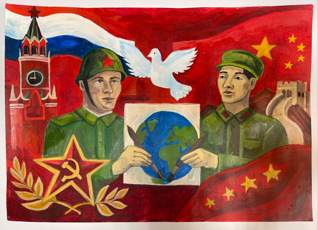 Чечаничева Дарья Ильинична«Солдаты мира»На рисунке изображены русский и китайский солдат. В центре композиции изображен земной шар, корой уверенными мазками рисуют солдаты, что символизирует создание ими крепкого мира. Также на картине изображены символы России и Китая, рассказывающие нам о ключевых культурных ценностях. В центре композиции мы видим голубя, как символ прочного мира.
