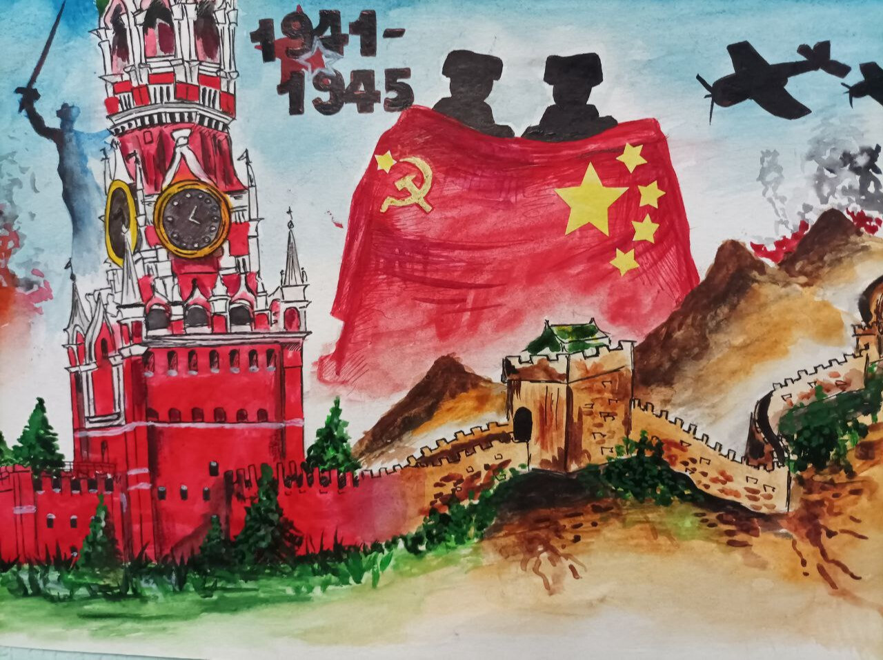 Эта работа — гимн нерушимому братству России и Китая, скреплённому в огне Великой Отечественной войны. Два солдата, что несут на своих плечах соединённые знамёна, олицетворяют общую тяжесть борьбы и общую Победу. Архитектурный символизм картины мощно подчёркивает главную мысль: Кремлёвская и Великая Китайская стены, сливаясь воедино, становятся несокрушимой крепостью мира, которую наши народы построили вместе, помня уроки прошлого.