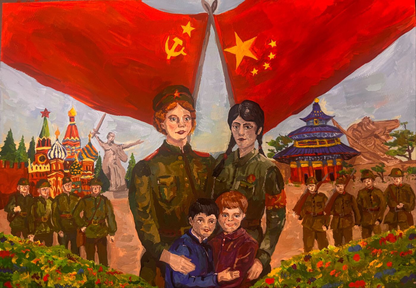 - На рисунке есть флаги обеих стран, две женщины- солдата. Русская девушка обнимает мальчика из Китая, а девушка из Китая обнимает русского мальчишку. Это показывает взаимопомощь стран, их братство и любовь друг к другу. Позади видны достопримечательности обеих стран. Слева-«Родина-мать зовёт!» — один из самых известных монументов, посвящённых героям Великой Отечественной войны. А так же символ Русской архитектуры- Московский Кремль. Справа-статуя Гуань Юя — легендарного китайского военачальника, обожествлённого в китайской культуре. Ещё изображён Храм Неба (Тяньтань, 紫禁城) в Пекине — один из самых известных архитектурных памятников Китая.