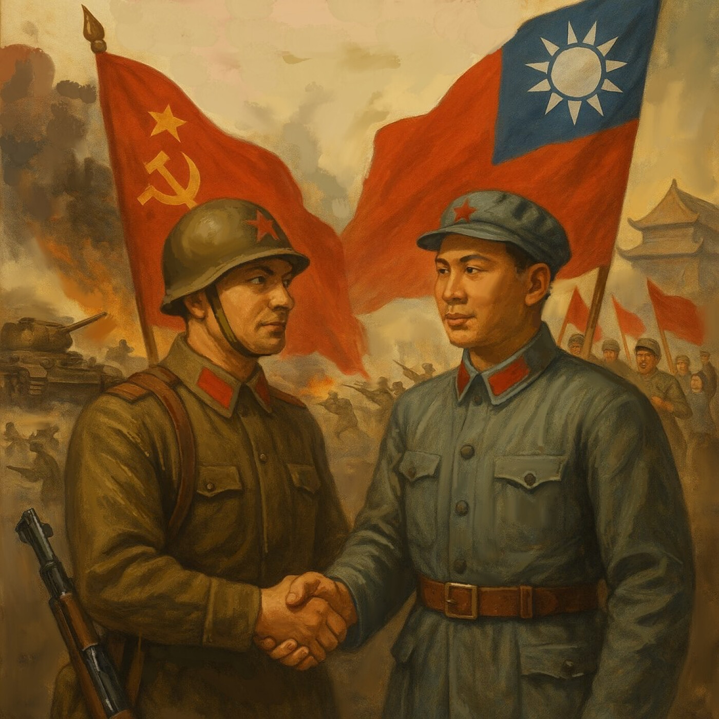 На картине две фигуры, символизирующие народы России и Китая, крепко пожимают руки на фоне штандартов и общего фронта. Это образ совместной борьбы против агрессии в годы Второй мировой — взаимопомощи, мужества и жертвенности ради будущего без войн. В дымке боя виднеются танки и строй бойцов, но в центре — человеческий обмен доверием, который хранит память о тех, кто отдал жизнь за свободу, и вселяет надежду на мирное сосуществование последующих поколений.Пожатие рук между фигурами олицетворяет союз, несмотря на символы войны вокруг, подчеркивая важность преодоления конфликтов и построения мостов между народами.