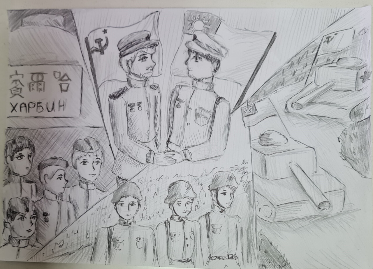 В своем рисунке я хотела показать дружбу народов России и Китая. Никакие войны не помеха нашей дружбе. Россия и Китай - братья. Я хотела показать совместную борьбу России и Китая против вторженцев в лице японцев. Готовность помочь Китаю в войне.