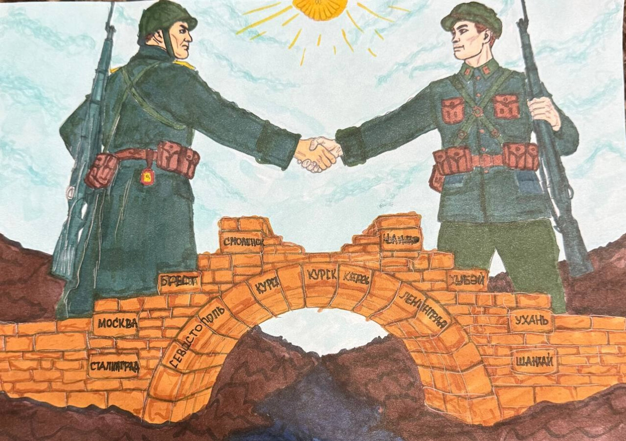 Русский солдат в плащ-палатке и китайский боец НОАК в форме времен войны — стоят по разные стороны пропасти, олицетворяющей фашизм и милитаризм. Они соединяют руки над этой рекой, и из их рукопожатия вырастает мост, сложенный из кирпичей с названиями ключевых битв.Общая память как основа сегодняшней дружбы.