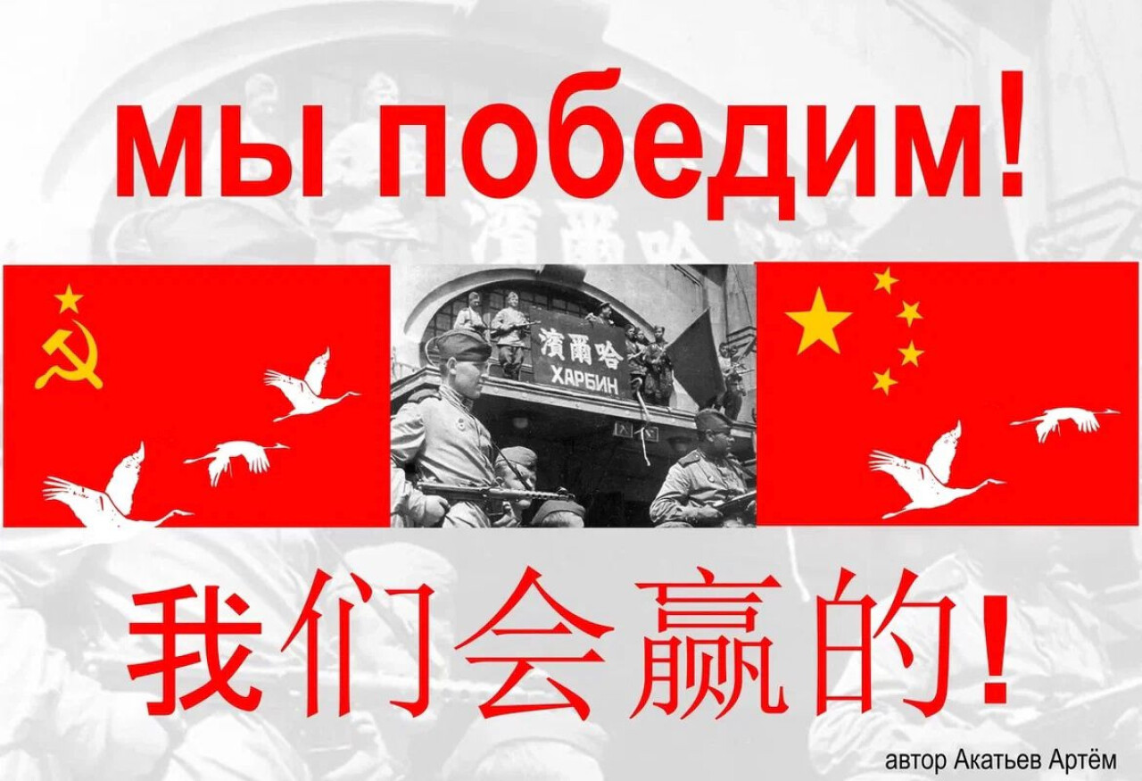 Победа в мировой антифашистской войне стала результатом единства стран с разными системами и культурами, поэтому изображены два флага – флаг России и флаг Китайской народной республики. Историческая фотография служит напоминанием о победе над японскими захватчиками. А фраза «Мы победим!» говорит о сплочении и единстве двух стран в борьбе с фашизмом.