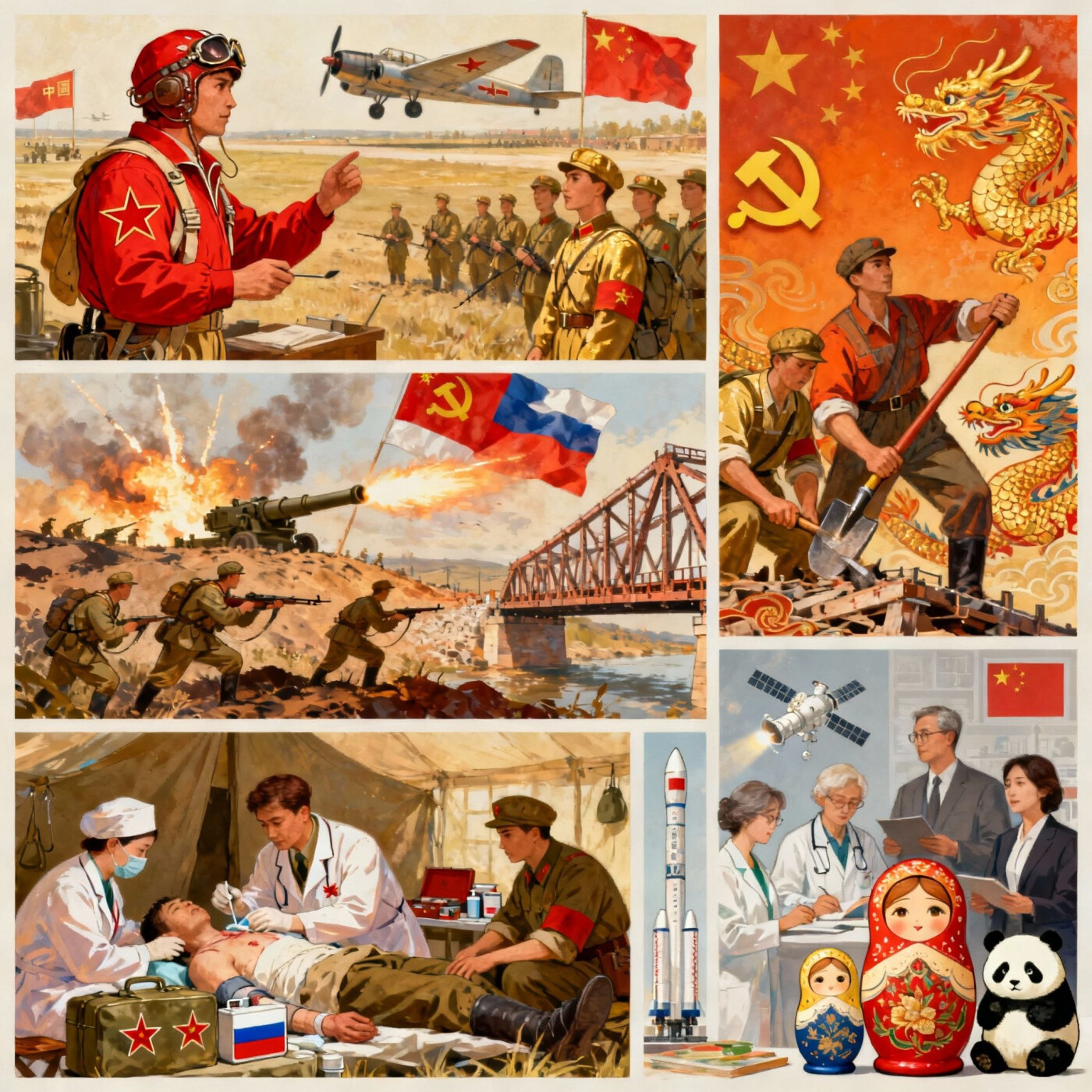 Коллаж объединяет ключевые моменты исторического и культурного взаимодействия России и Китая — от героических подвигов на фронтах и строительства инфраструктуры до совместных научных открытий и космических достижений. В композиции сочетаются военная сцена, символика дружбы, сюжеты медицинской помощи, научные советы и элементы народного искусства и природы. Всё это отражает глубокие связи, взаимную поддержку и стремление обеих стран к прогрессу и мирному развитию