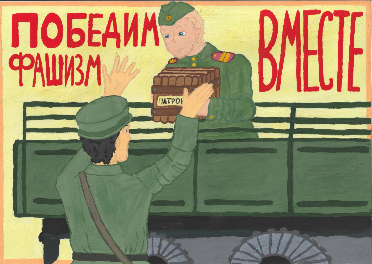 На моем рисунке изображен момент передачи советских боеприпасов военнослужащему дружественной китайской республики на автомобильном коридоре «Сары – Озек – Уручими – Ланьчжоу». Молодые люди едва знакомы, но очень симпатизируют друг другу. В их сердцах горит общее дело - борьба с врагом, защита отечества и граждан. Вполне возможно, что в будущем они станут лучшими друзьями.