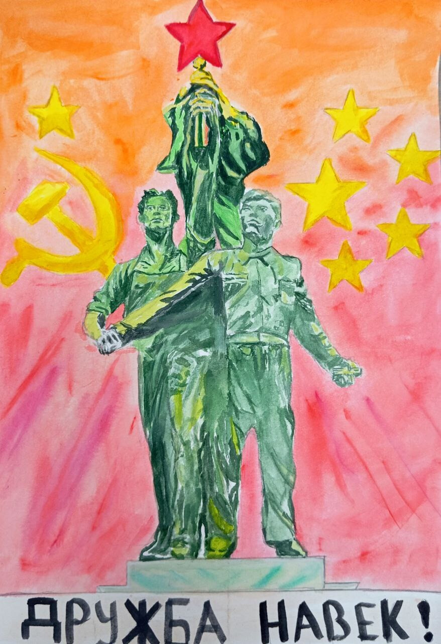 Рисунок символизирует крепкую дружбу и партнерские отношения между двумя великими странами. Изображены представители народов обеих стран, стоящие плечом к плечу, выражающие взаимное уважение и поддержку. Общий тон картины теплый и позитивный, отражает стремление к миру и сотрудничеству между двумя странами.