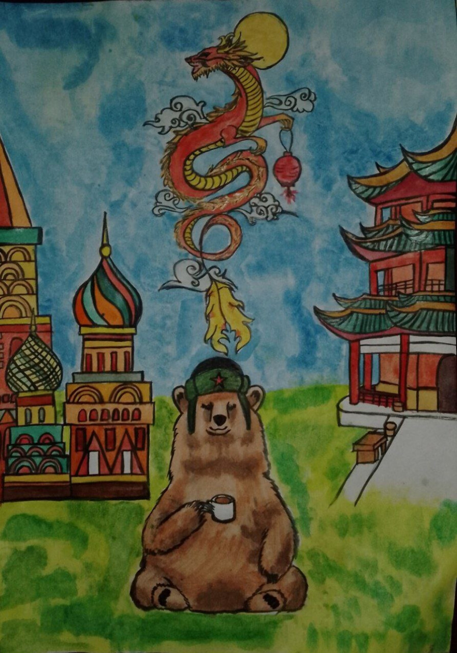 Этот рисунок показывает крепкую дружбу России и Китая. В центре — русский медведь в ушанке с чашкой чая: символ гостеприимства, спокойствия и силы. Над ним парит китайский дракон — воплощение мудрости, энергии и величия. По бокам — знаковые образы двух стран: купола собора Василия Блаженного и изящная пагода. Они подчёркивают уникальность культур, но и их гармоничное сосуществование. Чай в лапах медведя и дракон в небе — символы взаимного уважения, доверия и стремления к общим целям.