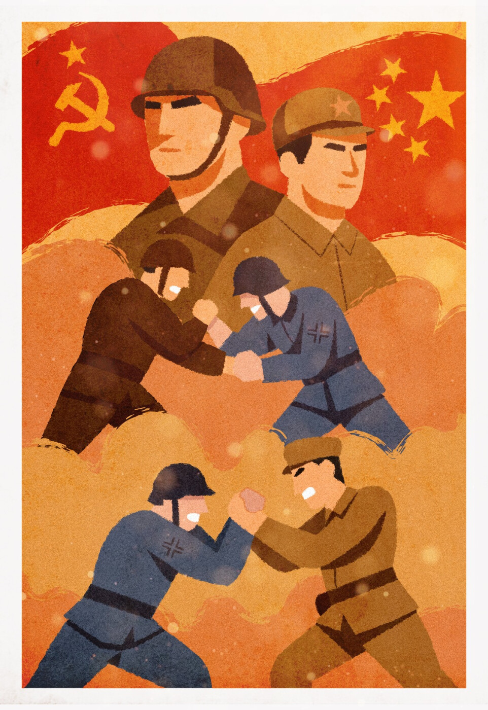 На рисунке советские и китайские солдаты, которые совместно сражаются против фашистской Германии во Второй мировой войне. Солдаты России и Китая изображены в динамичных позах, что подчеркивает их решимость и единство в борьбе с врагом. На фоне видны флаги СССР и Китая, что символизирует союз двух стран. Плакат передает идею силы и солидарности в борьбе против общего врага.