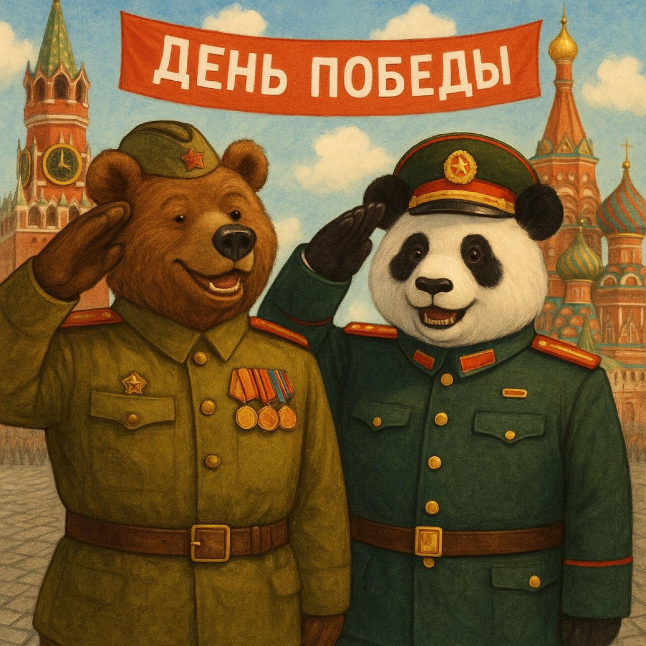 В параде Победы 9 мая на Красной площади в Москве в этом году принимала участие китайская делегация. Все мы знаем, что Россию ассоциируют с бурыми медведями, а Китай - с пандой. Я изобразила наши страны именно так. Да, мы разные. Но мы сильные добрые мишки.