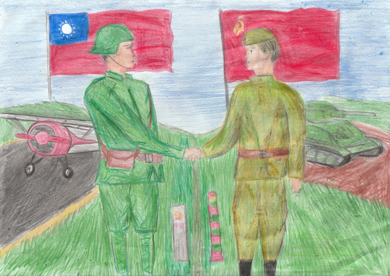 Своим рисунком я хочу передать единство двух стран в борьбе с фашизмом и милитаризмом. Солдаты двух держав, как братья, помогали друг другу в великой борьбе ради мира на земле. Их разделяла родина и языки, но они были едины, их союз был крепче любой стали. Никакие враги не смогли их остановить. Именно они стали той великой силой, что смогла победить.